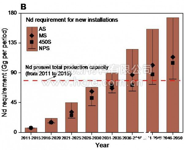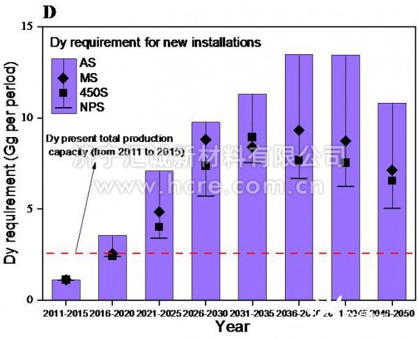 在此背景下(xià),擴大稀土生産(chan)、材料循環利用(yòng)、提高稀土‼️使用(yòng)效👣率、以及風機(ji)技術革新都能(néng)一定程度上緩(huǎn)解稀土✌️資源短(duan)缺問題。目前,稀(xī)土資源被認爲(wei)是受保護的戰(zhàn)略👄性礦産💘資源(yuán),短❗期内大幅度(dù)擴大産量難以(yi)實👌現。因此,稀土(tu)的循環利用以(yǐ)及技術革新能(neng)夠在一定💔程度(du)上緩解長期的(de)稀土資源短缺(quē)壓🈲力。風力渦輪(lún)機的壽命通常(chang)爲20年,這就意味(wèi)着2040年大量稀土(tǔ)将随風機⭕退役(yi),是可觀的潛在(zai)稀土資源。如:2021-2050年(nián)間,镝(Dy)每年的退(tuì)役量将從0.01 Gg逐漸(jian)增加到1.2-2.1 Gg (圖2)。在“新(xīn)政策情境”(New Policies Scenario )情境(jìng)下,回收的❤️镝(Dy)可(ke)能在2048-2050超過對其(qi)的需求。此外,增(zēng)加稀土使用效(xiào)率🏃♀️及技術革新(xin)能🌏降低風力❓發(fā)電對稀土💔資源(yuán)的需求,能🏃🏻緩解(jiě)長期的稀土危(wei)機。